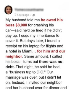 1. Betrayal Revealed I was married to Mike for seven years, trusting him completely. When my grandmother left me $15,000, I confided only in him. Later, he claimed, “I crashed my boss’s car… I owe him $8,000 or I’m fired.” I wired the money immediately. 2. The Lie Uncovered While searching his laptop, I found “Tickets_Miami.pdf”—two tickets, […]