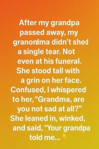 At my grandfather’s funeral, my grandmother stood with quiet strength, smiling gently while others mourned. Puzzled by her calm demeanor, I leaned in and asked if she wasn’t sad. With warmth in her eyes, she whispered that my grandpa had asked her not to cry for him, but to live for him. I didn’t fully […]