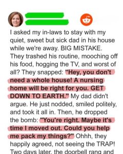 I asked my in-laws to stay with my quiet, sweet but sick dad in his house while we’re away. BIG MISTAKE. They trashed his routine, mooching off his food, hogging the TV, and worst of all? They snapped: “Hey, you don’t need a whole house! A nursing home will be right for you. GET DOWN […]