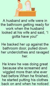 A husband and wife were in the bathroom getting ready for work when the husband looked at his wife and said, “I gotta have you!” With a sudden burst of passion, he pushed her up against the bathroom door, pulling down her underclothes and taking her right then and there. As he continued, his wife […]
