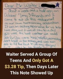 $3.28 tip irritates the waiter. When an unexpected letter arrives days later, eyes widen.