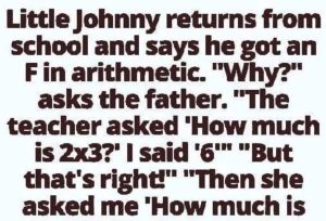 Most people didn’t enjoy math in school—numbers, fractions, and percentages aren’t exactly easy. Little Johnny was no exception, and his poor multiplication skills got him into trouble. He came home and told his dad, “I got an F in math today.” His dad asked, “What happened?” Johnny explained, “The teacher asked, ‘What’s 3 times 2?’ […]
