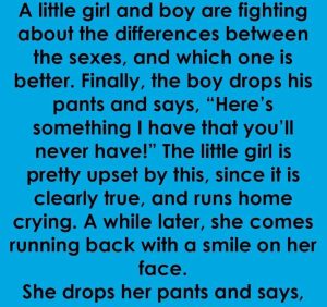 A little girl and boy are fighting about the differences between the sexes, and which one is better. Finally, the boy drops his pants and says, “Here’s something I have that you’ll never have!” The little girl is pretty upset by this, since it is clearly true, and runs home crying. A while later, […]