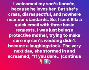 I welcomed my son’s fiancée, Ella, into our family because he loves her. But she’s crass, disrespectful, and nowhere near our standards. Her family? Even worse – totally embarrassing. The wedding is a grand affair, and I want everyone to actually enjoy it. So, I sent Ella a quick email with three basic requests. The […]